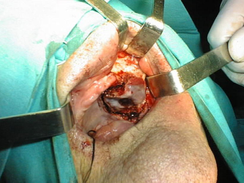 Paziente di 92 anni portatore di un carcinoma squamoso dell’emipalato duro di sx infiltrante il seno mascellare omolaterale T4N1. È stata effettuata una maxillectomia parziale con dissezione conservativa del collo.